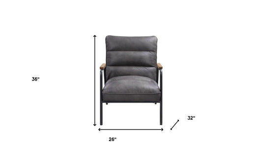 26" Gray Top Grain Leather And Steel Solid Color Arm Chair