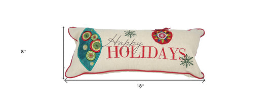 8" X 18" Beige and Red Christmas Ornaments Linen Blend Zippered Pillow With Embroidery
