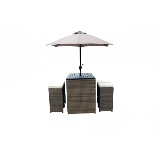Six Piece Brown and White Faux Wicker Outdoor Bar Height Table Set with Umbrella and Stools