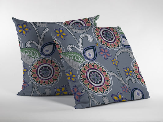 16” Gray Indigo Paisley Zippered Suede Throw Pillow