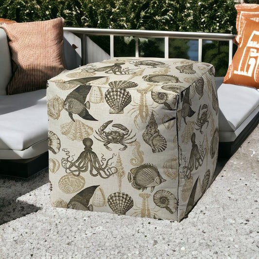 17" Beige and Gray Polyester Cube Coastal Indoor Outdoor Pouf Ottoman