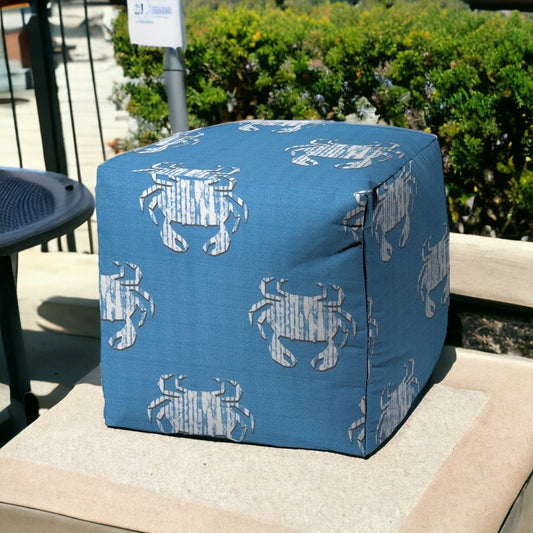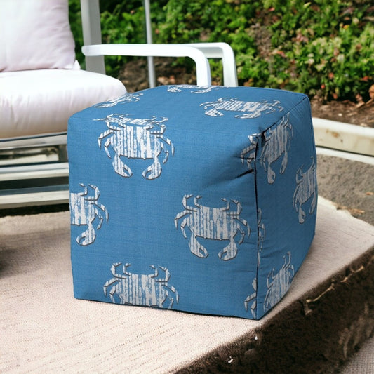 17" Blue and White Polyester Cube Crab Indoor Outdoor Pouf Ottoman