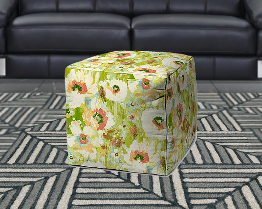 17" Green Polyester Cube Floral Indoor Outdoor Pouf Ottoman