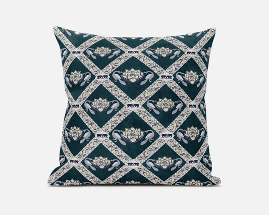 18" X 18" Dark Green Yellow Gray Lotus Floral Blown Seam Suede Throw Pillow