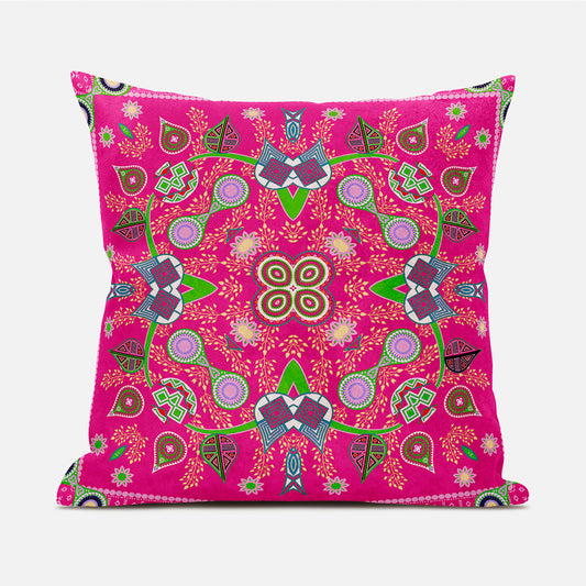 18" X 18" Pink And Green Geometric Blown Seam Suede Throw Pillow