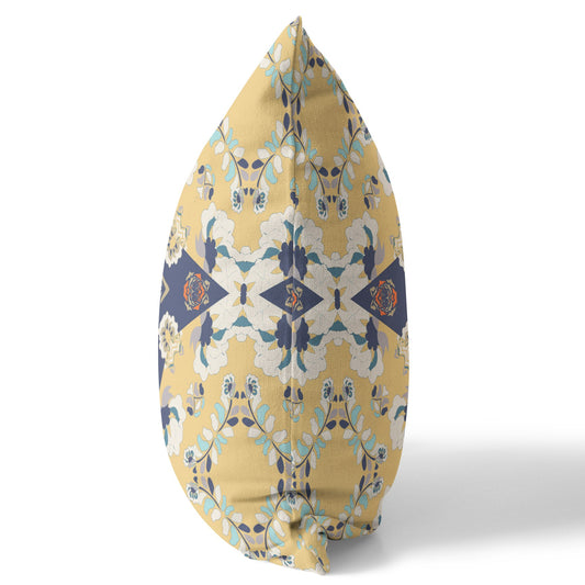 18" X 18" Yellow And Navy Floral Blown Seam Suede Throw Pillow