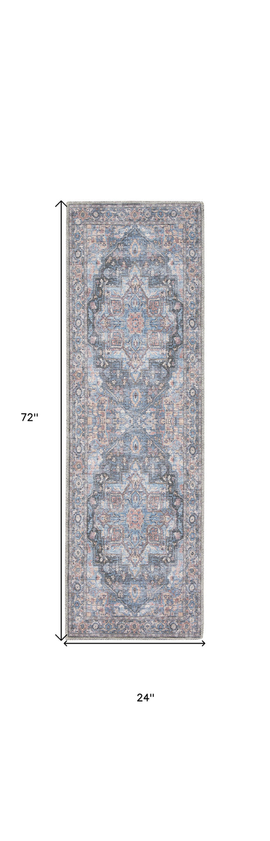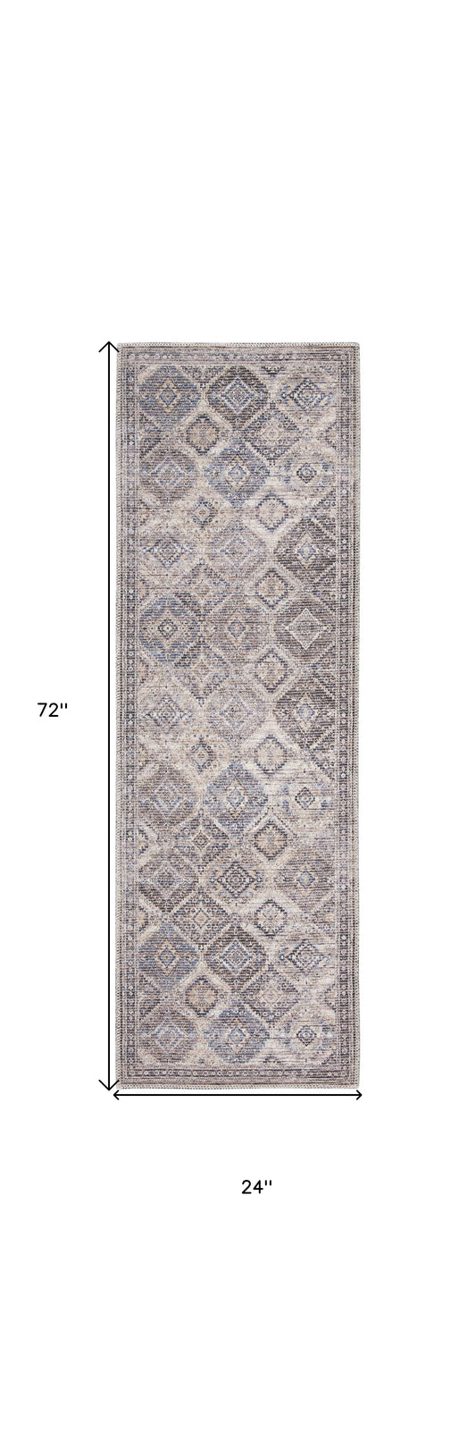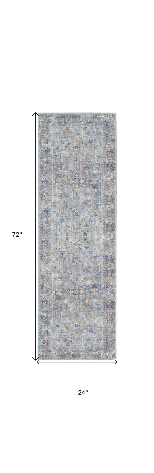 2' X 6' Light Grey And Blue Oriental Power Loom Distressed Washable Runner Rug