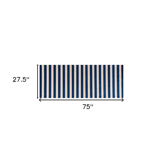 2' X 6' Navy And Sand Striped Tufted Washable Non Skid Area Rug