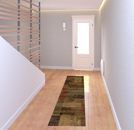 2' X 8' Green Blue Grey Ivory And Brown Abstract Power Loom Stain Resistant Runner Rug