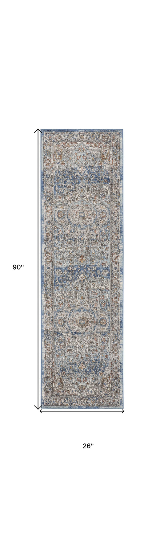 2' X 8' Ivory And Blue Oriental Power Loom Non Skid Runner Rug