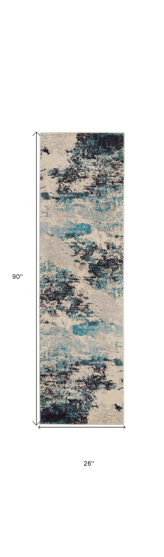 2' X 8' Ivory And Teal Blue Abstract Power Loom Non Skid Runner Rug