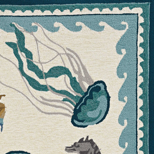 2'X3' Ivory Teal Hand Hooked Uv Treated Bordered Coastal Sea Life Indoor Outdoor Accent Rug