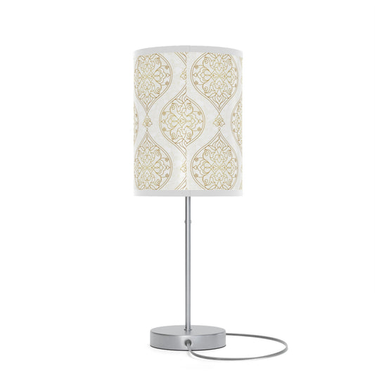 20" Silver Table Lamp With Gold And White Filigree Scroll Cylinder Shade