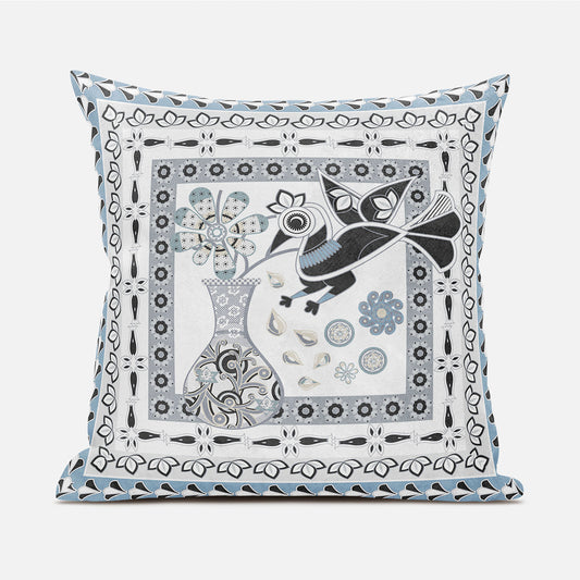 20" X 20" Black Gray and White Peacock Broadcloth Floral Zippered Pillow
