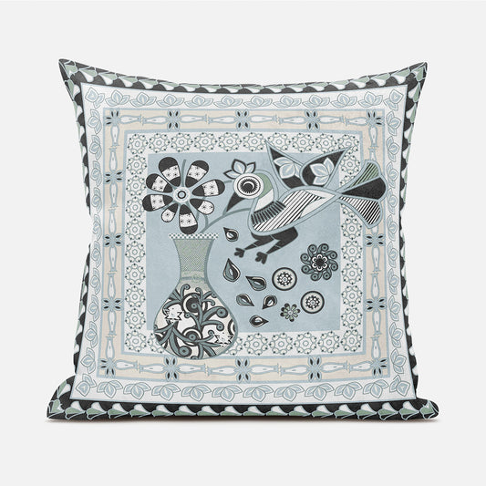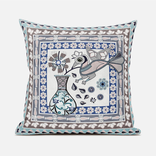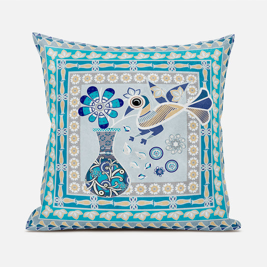 20" X 20" Blue and Beige Peacock Broadcloth Floral Zippered Pillow