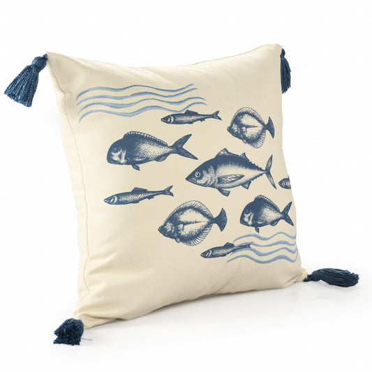 20" X 20" Blue And Cream Fish Polyester Animal Print Zippered Pillow