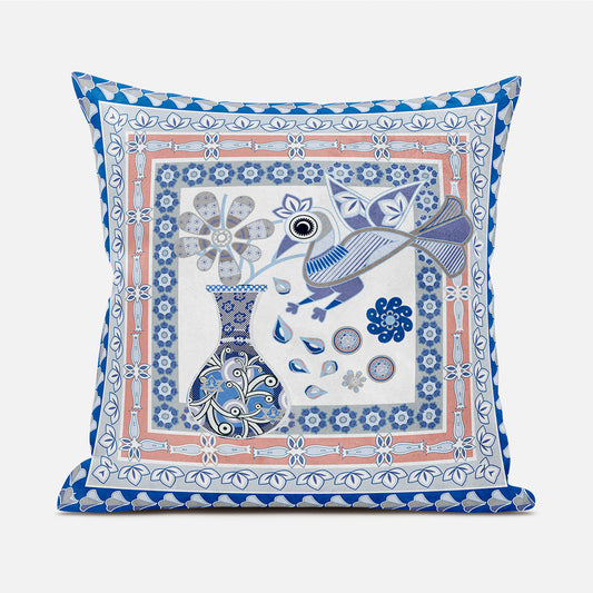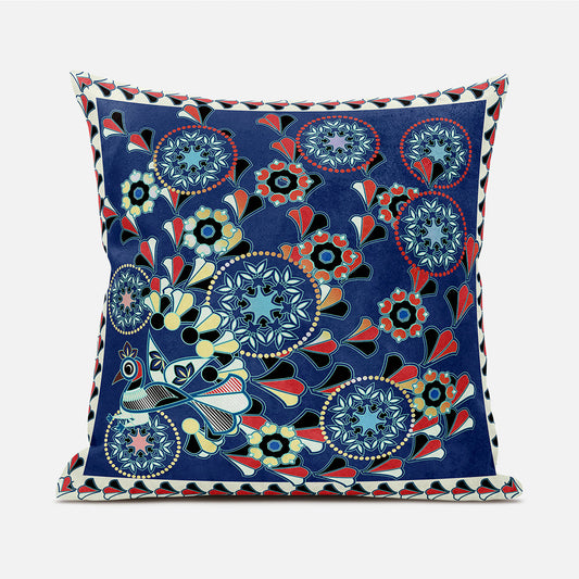 20" X 20" Blue and Off White Peacock Broadcloth Floral Zippered Pillow