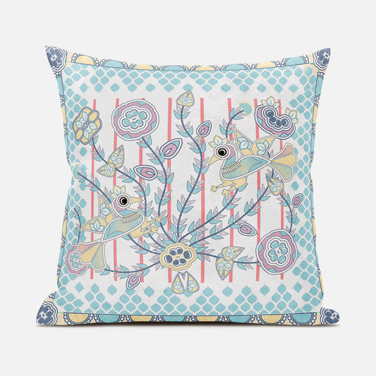 20" X 20" Blue and Yellow Bird Floral Cotton Zippered Pillow With Embroidery