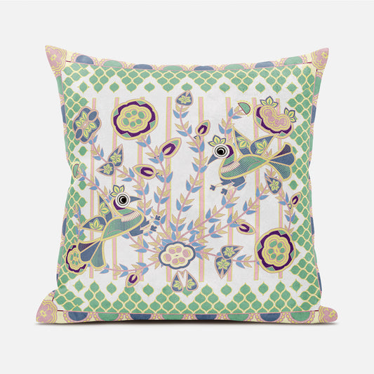 20" X 20" Green Blue And Off-White Bird Polyester Animal Print Zippered Pillow
