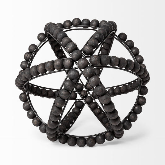 11" Black Wooden Bead And Metal Orb Sculpture