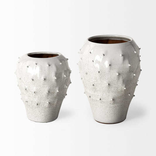 11" White Spiked Organic Glaze Large Mouth Ceramic Vase