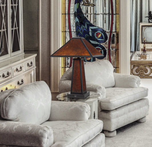 24" Burnt Orange Metal Two Light Table Lamp With Amber Square Shade