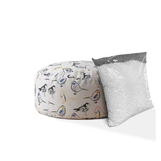 24" Yellow And White Canvas Round Birds Pouf Ottoman