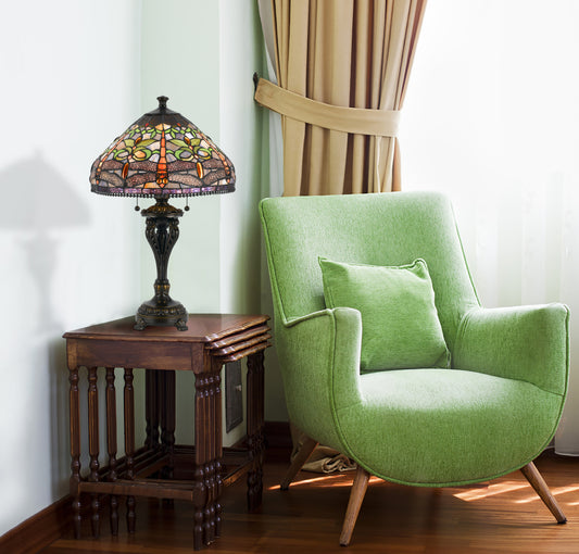 26" Black Metal Two Light Table Lamp With Purple And Ivory Dome Shade