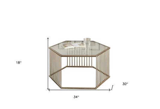 34" Champagne And Clear Glass And Metal Hexagon Coffee Table
