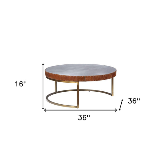 36" Brown And Silver Leather And Metal Round Coffee Table
