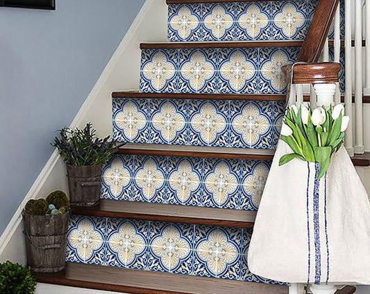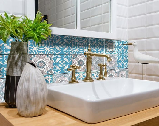 4" X 4" Taupe and Blue Scroll Peel and Stick Tiles