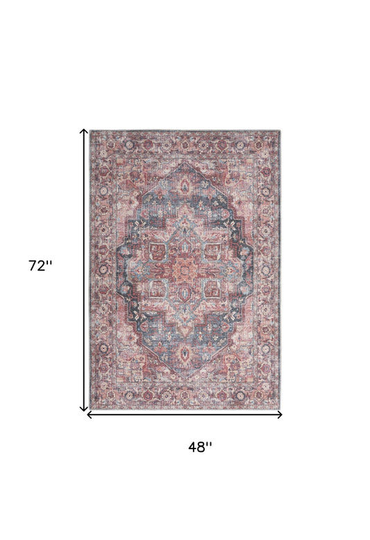 4' X 6' Navy And Salmon Damask Distressed Stain Resistant Area Rug
