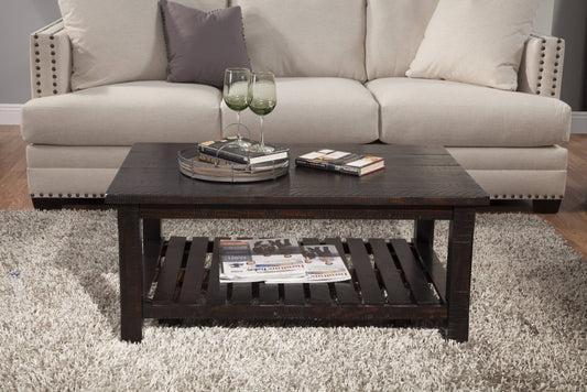 42" Espresso Solid Wood Rectangular Distressed Coffee Table With Shelf