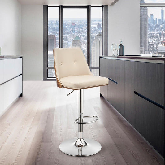 44" Cream And Walnut Faux Leather And Steel Swivel Adjustable Height Bar Chair
