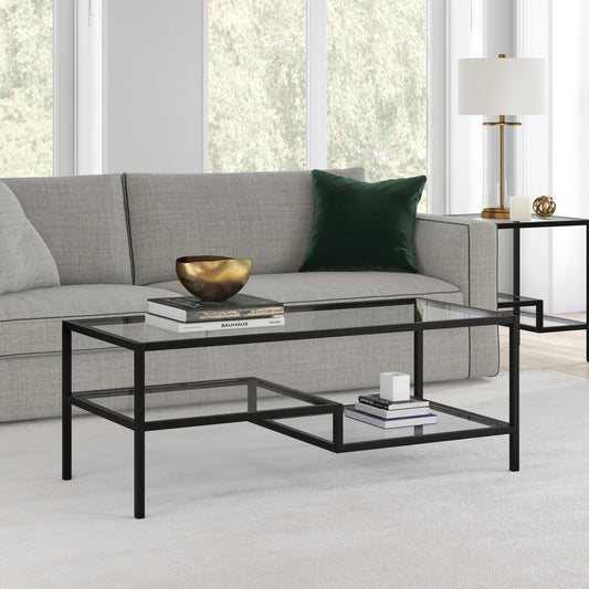 45" Black Glass And Steel Coffee Table With Two Shelves