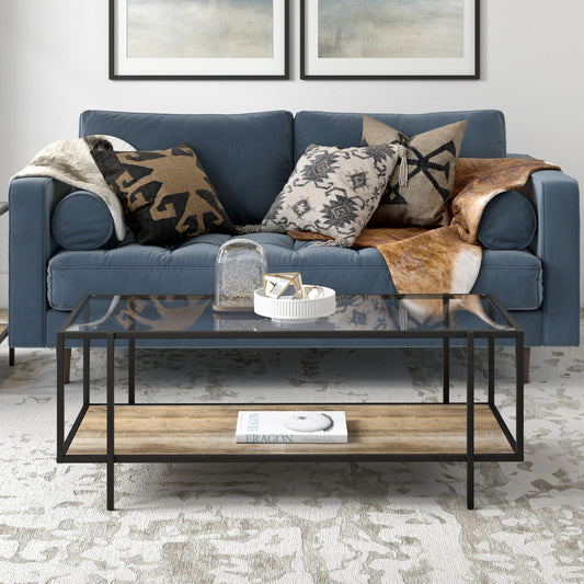 45" Brown Glass And Solid Wood Rectangular Coffee Table