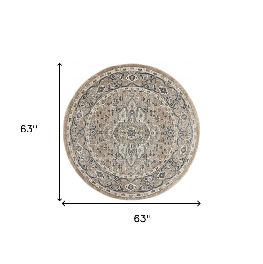 5' X 5' Beige And Grey Round Oriental Power Loom Non Skid Area Rug