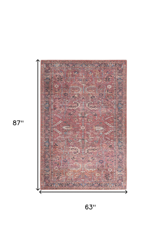5' X 7' Brick Oriental Power Loom Distressed Washable Area Rug