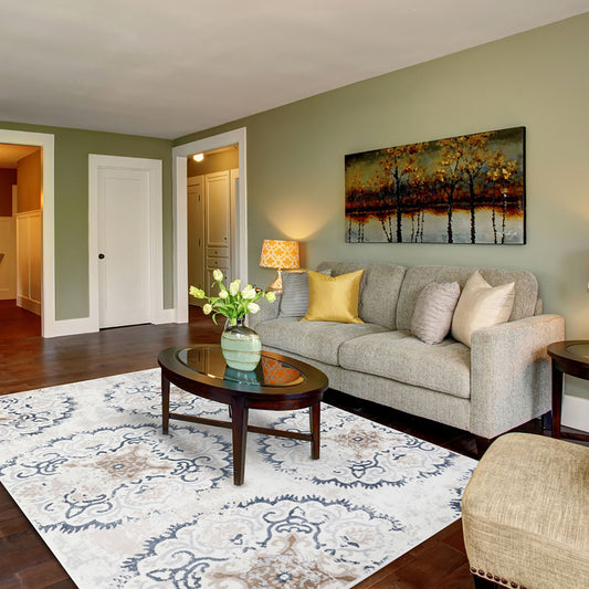 5' X 8' Ivory Geometric Medallion Stain Resistant Area Rug