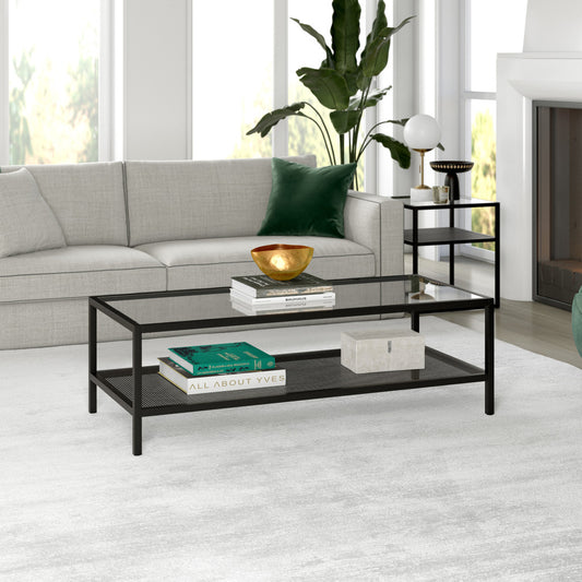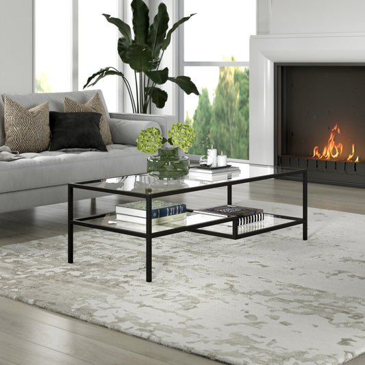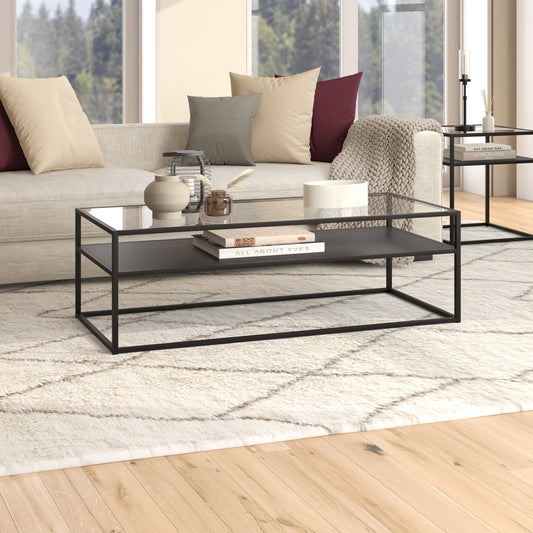 54" Black Glass And Steel Coffee Table With Two Shelves