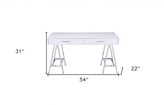 54" White And Silver Writing Desk With Two Drawers