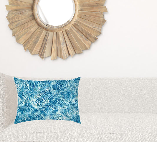 14" X 20" Blue And White Blown Seam Ikat Lumbar Indoor Outdoor Pillow
