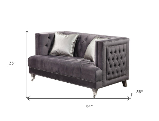 61" Gray And Silver Velvet Love Seat And Toss Pillows