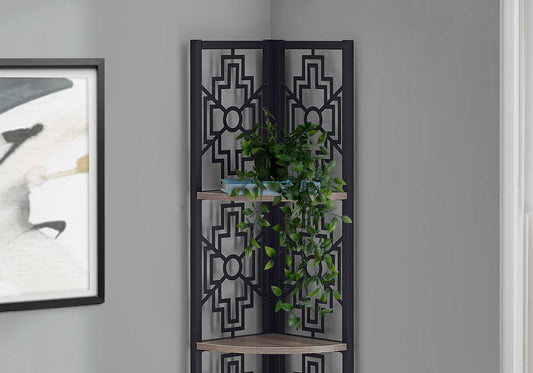 62" Bookcase With 4 Solid Taupe Shelves And Black Metal Corner Etagere