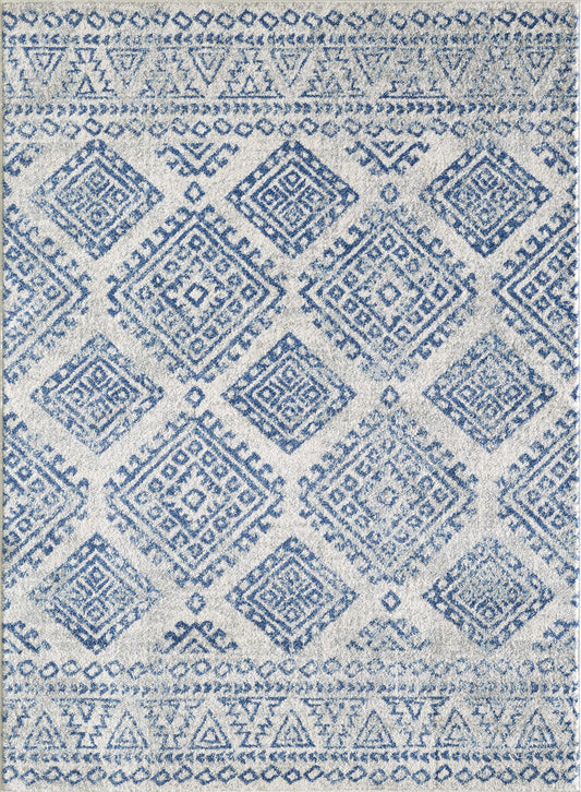 7' Ivory Blue Machine Woven Distressed Geometric Indoor Runner Rug