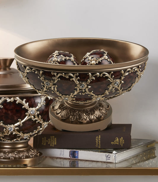 8" Marbleized Green And Gold Polyresin Decorative Bowl With Orbs