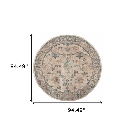 8' Ivory Blue Gold And Grey Round Oriental Power Loom Stain Resistant Area Rug
