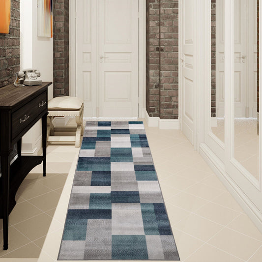 8' Teal And Gray Patchwork Power Loom Stain Resistant Runner Rug