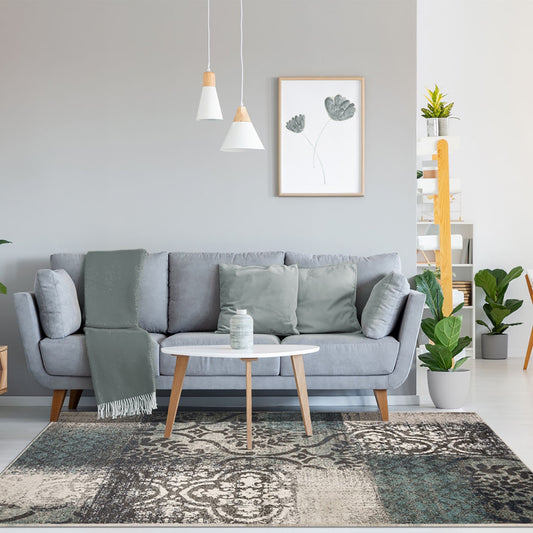 8' X 10' Teal And Gray Damask Distressed Stain Resistant Area Rug