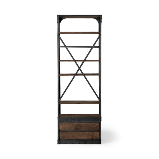 94" Black Iron Five Tier Standard Bookcase With Two Drawers